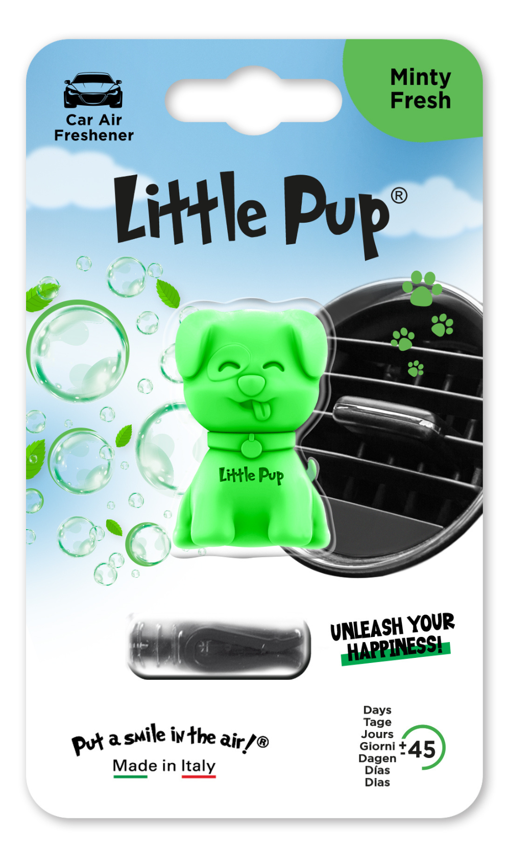 Little Pup Fresh Mint je osvežujoča avtomobilska dišava s hladnim vonjem mete, ki poskrbi, da je vaš avtomobil ob vsaki vožnji svež in poživljajoč.